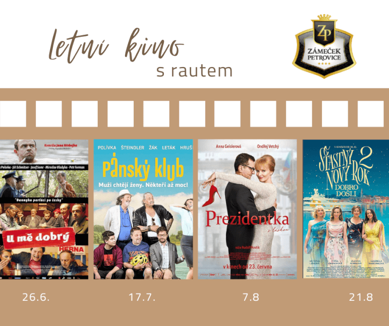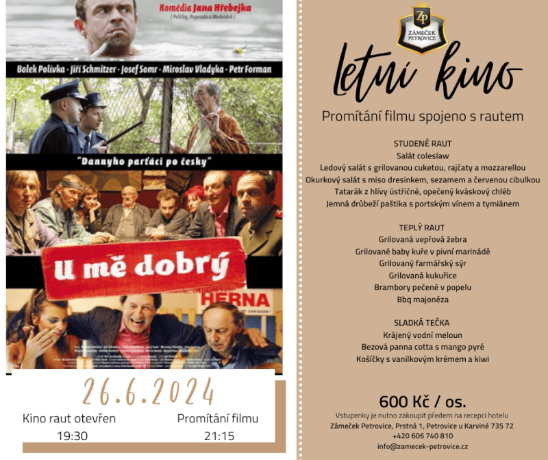 Zámeček Petrovice Vás zve do letního kina na český film „U mě dobrý“, které je spojené s rautem. Studené...